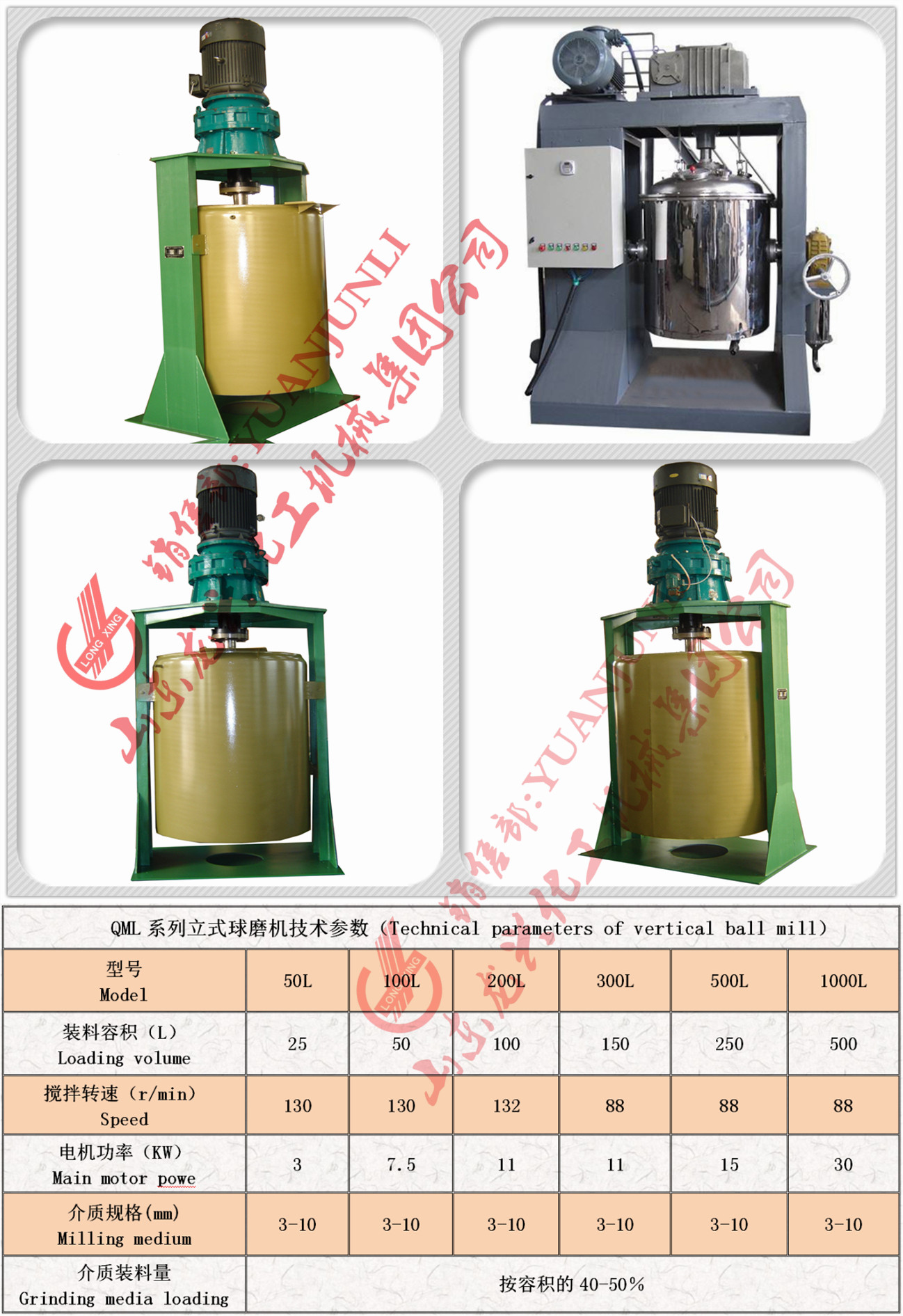 立式攪拌球磨機物料不需預混合即可直接加入帶夾套的研磨缸中,配方中的其它只需稍微研磨的成分可在稍后加入研磨缸中。
