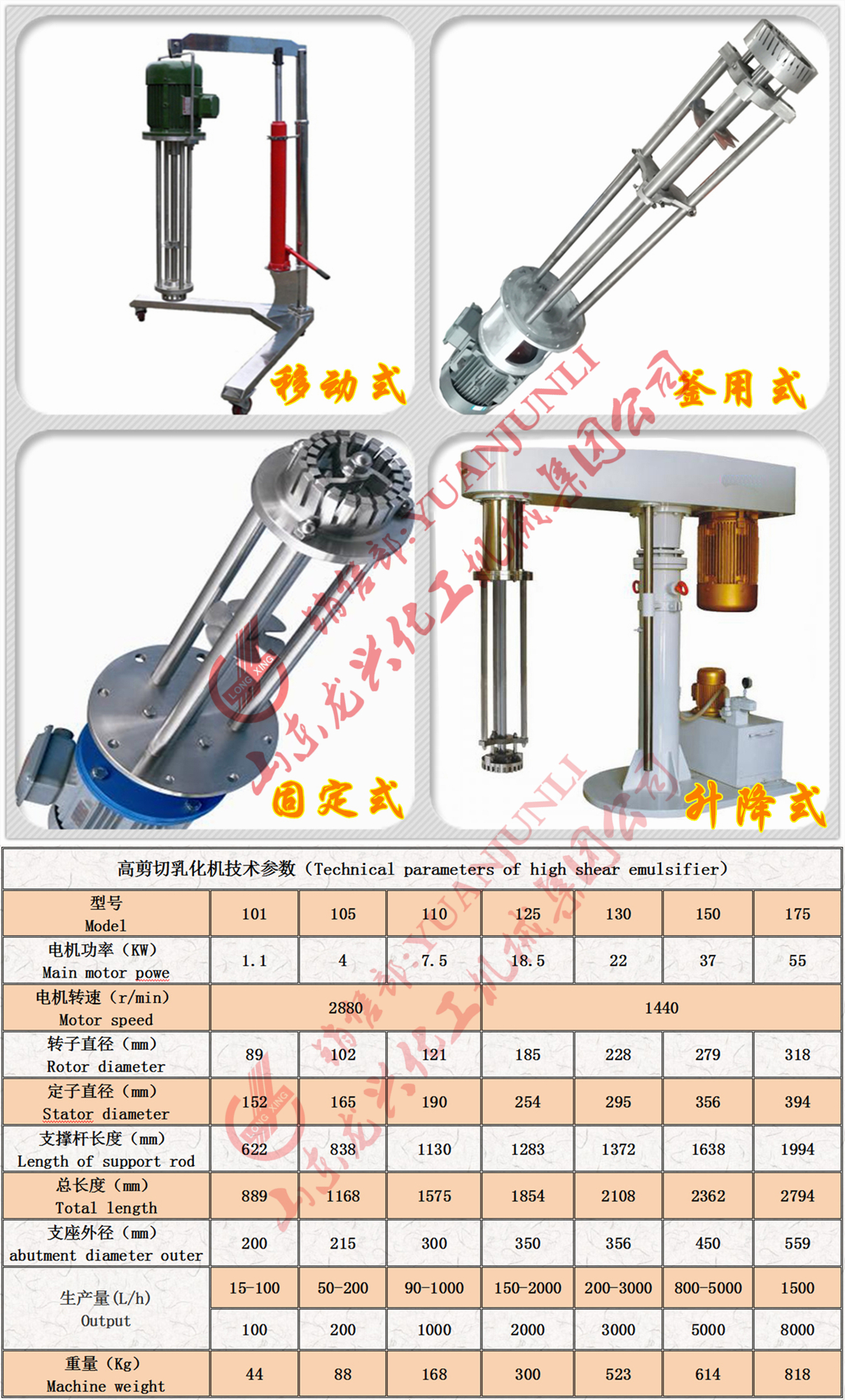 山東萊州高剪切分散乳化機根據(jù)應(yīng)用工況可分為移動式高剪切分散乳化機以及升降式高剪切分散乳化機和固定式高剪切分散乳罐,龍興集團為您供101-150型系列移動式高剪切分散乳化機。