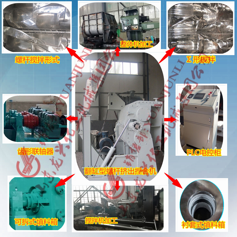 下出料捏合機主要是由混捏部分、螺 桿擠出部分、機座部分、液壓系統(tǒng)、傳動系統(tǒng)和電控系統(tǒng)等五大部分組成。液壓系統(tǒng)由一臺液壓站來操 縱大油缸,來完成啟閉功能,液壓系統(tǒng)由一臺液壓站來操縱油缸,來完成翻缸、啟蓋等功能;傳動系統(tǒng)由電動機、減速機和齒輪組成,實 現(xiàn)了大扭矩的動力輸出,動力經(jīng)齒形軸器傳輸出到快漿軸上,使其達到規(guī)定的轉速,也可 由變頻器進行調(diào)速。另外該型設備的具體細節(jié)配置可根據(jù)用戶工藝靈活搭配。